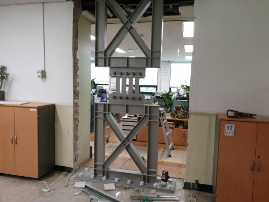 طبق ارزیابیهای صورتگرفته در این پروژه، کارفرما به دلیل اهمیت بالای کاربری سازه قصد دارد تا آن را در برابر زلزله بهسازی کند. .طبق درخواست کارفرما عملیات ارزیابی و طراحی نیز شروع گردید. – طبق ارزیابیهای صورتگرفته در این پروژه،برای اجرای عملیات بهسازی لرزهای از میراگرهای تسلیمی استفاده میگردد.زیرا این عضو در قاب سازه باعث میشود که تغییر شکل و همچنین سختی عضوها افزایش یابد.زیرا انرژی و نیروی جانبی وارد شده به سازه صرف تسلیم و رفتار غیرخطی در قطعات بکار رفته میشود.در نتیجه سازه رفتاری مناسبتر در برابر نیروهای جانبی وارد شده،از خود نشان میدهد.راهکار بهسازی به دو دسته طراحی و اجرا تقسیم میشود که به شرح زیر است : مرحله طراحی