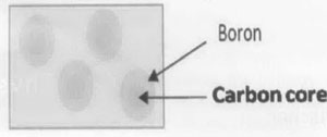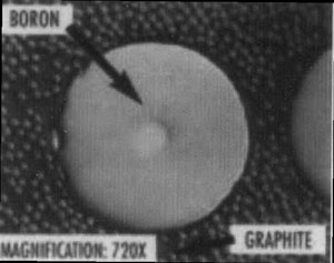 در صنعت ھوافضا استفاده از الیاف بور با ھسته کربنی در تولید کامپوزیتھای خاص بسیار رایج می باشد که تصویری از این کامپوزیت در شکل ٢ آورده شده است. ھمچنین در شکل ٣ تصویری از الیاف بور در بستری از جنس گرافیت نشان داده شده است