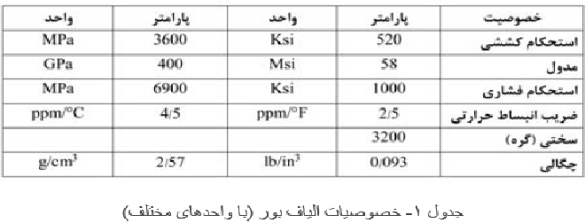 الیاف بور برای اولین بار در حدود ٣۵ سال پیش به عنوان یک لیف با استحکام و مدول بسیار زیاد، دانسیته کم در صنعت ھوافضا مورد استفاده قرار گرفت و پس از آن به مرور استفاده از این الیاف در سایر صنایع کامپوزیتی نیز رایج گردید. در بیشتر موارد قطر این الیاف در حدود ١٠٠ میکرون است، اما الیافی با قطر ١۴٢ میکرون نیز به صورت تجاری تولید می شود که مشخصات آن در جدول ١ آورده شده است