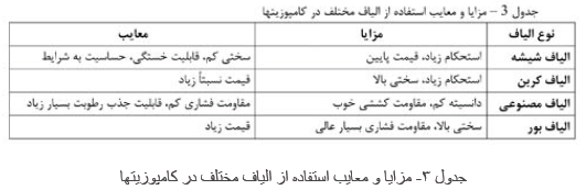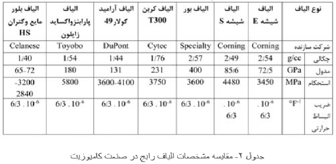 از آنجاییکه لیاف بور ذاتاً بسیار شکننده بوده نسبت به نایکنواختی قطر بسیار حساس می باشند، زیرا که تنش متمرکز شده بر روی نواحی نازک این الیاف به دلیل عدم توانایی تغییر شکل پلاستیکی در آنھا بسیار بیشتر از تنش اولیه می شود و بدین ترتیب این الیاف سریعاً در یک یا چند ناحیه دچار ترک می شوند. جھت ارزیابی بھتر خصوصیات مکانیکی این الیاف تعدادی از این خصوصیات در مقایسه با سایر الیاف تجاری که در صنعت کامپوزیت مورد استفاده قرار می گیرند در جدول ٢ آورده شده است. ھمانگونه که از این جدول مشخص است مدول این الیاف بسیار بیشتر از سایر رقبا بوده و استحکام آن در حد سایر رقبا می باشد. (چگالی مندرج در این جدول مربوط به چگالی بور خالص است)
