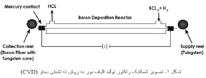 بطور کلی در فرایند تهنشینی بخار شیمیایی (CVD) یک ماده به صورت بخار حاوی ذرات بسیار ریز و با چگالی کم بر روی یک ماده ھدف که می تواند به صورت سیمی و فیلامنتی باشد تهنشین می شود و به مرور با افزایش ضخامت لایه تهنشین شده فیلامنت مذکور با قطر مورد نیاز تولید می شود. مسلماً ضخامت و تعداد لایه تهنشین شده مھمترین عوامل موثر بر روی استحکام و مدول الیاف نھایی می باشد. در فرایند تولید الیاف بور مخلوط گازی تری کلرید بور و گاز ھیدروژن وارد محفظه دستگاه می شوند و از واکنش آنھا به صورت زیر فلز بور بر روی سیم ھدف تهنشین شده و اسید ھیدروکلریک خارج می شود. در طی این فرایند اتم ھای بور حاصله به صورت جامد بر روی سیم تنگستن تهنشین می شوند و به صورت ترکیب W2B5 و یا WB4 در می آیند. در آغاز این فرایند قطر سیم تنگستنی در حدود ١٠ میکرومتر است که به مرور تا حد ١٢ میکرومتر افزایش می یابد. البته باید توجه داشت که محصول این فرایند تنش باقیمانده زیادی خواھد داشت زیرا که سیم ھدف تحت نیروی فشاری بوده و لایه تهنشین شده بر روی آن تحت تنش کششی است. در شکل ١ به صورت شماتیک قسمتھای مختلف این دستگاه نشان داده شده است.