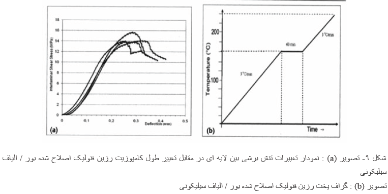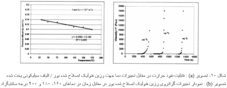 در شکل ۹ نمودار تغییرات خصوصیات فیزیکی الیاف بور تحت عملیات پخت قرار گرفته به نمایش گذاشته شده است و در شکل ۱۰ قابلیت نفوذ حرارت در این الیاف در دماهای مختلف نشان داده شده است.