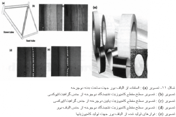 ھمانگونه که گفته شد مھمترین کاربرد این الیاف در تولید ساختارھای کامپوزیتی به عنوان عامل ایجاد کننده استحکام در بستر پلیمری است. در تولید لوله ھای کامپوزیتی که عمدتاً در ساخت ابزار وزرشی نظیر بدنه دوچرخه، راکت، چوب گلف و … مورد استفاده قرار می گیرد به خوبی می توان از این کامپوزیتھا استفاده نمود. مھمترین ویژگی ھای قابل انتظار از این کامپوزیتھا عبارتند از وزن کم، استحکام زیاد، چقرمگی، انعطاف پذیری و قابلیت جذب نیروی ضربه، مقاومت در برابر خوردگی و … . علاوه بر این استفاده از این کامپوزیتھا در ساخت تجھیزات صنایع ھوافضا و ملزومات نظامی نیز بسیار رایج است. در شکل ١١ تعدادی از کاربردھای این کامپوزیتھا در ساخت تجھیزات ورزشی نشان داده شده است و در جدول ٣ مزایا و معایب انواع مختلف الیاف مستحکم کننده کامپوزیتھا آورده شده است.