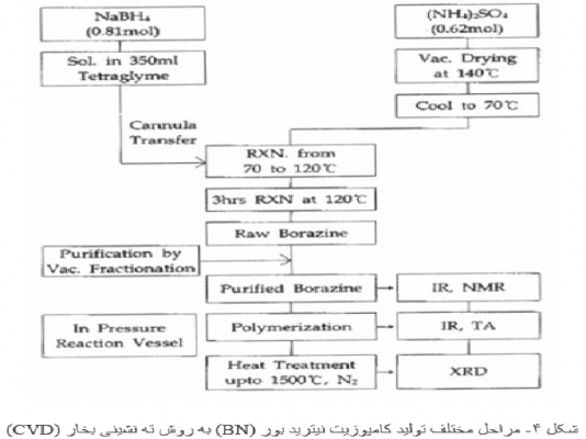 فرایند تجاری تولید الیاف بور دارای مراحل متعدد و پیچیدگی ھای خاصی است که در فلوچارت شکل ۴ بطور کلی مراحل مختلف تولید کامپوزیت نیترید بور (BN) به روش تهنشینی بخار به نمایش در آمده است.