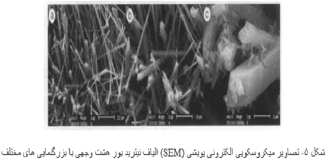 در شکل ۵ تصاویر میکروسکوپی الکترونی پویشی (SEM – Scanning Electron Microscopy) الیاف نیترید بور ھشت وجھی با بزرگنمایی ھای مختلف به نمایش درآمده است. ھمانطور که در این شکل مشخص است بر روی سطح این الیاف ذرات براده شکلی مشاھده می شود که از مشخصه ھای ویژه الیاف تولید شده به روش تهنشینی بخار می باشد. تصویر C در این شکل دارای بزرگنمایی ١٠ ھزار برابر بوده و الیافی با قطر ٢-١ میکرون را نشان می دھد.