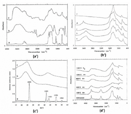 در شکل ۶ نتایج حاصل از آزمایشات مختلف بر روی این الیاف را نشان می دھد. تصاویر a’ الی d’ مربوط به آزمایشات طیف سنجی مادون قرمز (FTIR – Fourier Transform Infra-Red) در شرایط مختلف و ھمچنین آزمایش پراش پرتو اشعه ایکس می باشد که در ھر کدام از آنھا با ارزیابی موقعیت پیکھای مختلف می توان تغییرات صورت گرفته در ساختار را مورد ارزیابی قرار داد.