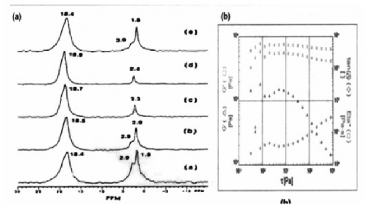 در شکل ٧ نمودار گرماسنجی تفاضلی پویشی (DSC – Differential Scanning Calorimetry) به ھمراه نمودار تغییرات وزنی در حین حرارت دھی – پایداری حرارتی (TGA – Thermal Gravimetric Analysis) نمایش داده شده است. به کمک این نمودارھا می توان تغییرات فازھا، دمای انتقال شیشه ای، دمای ذوب، دمای تبلور و … را به راحتی متوجه شد. در شکل ٨ نتایج آزمایش رزونانس مغناطیسی ھسته (NMR – Nuclear Magnetic Resonance) این الیاف در کنار نتایج آزمایش سنجش خصوصیات دینامیکی -مکانیکی به نمایش درآمده است. این طیف ھا مربوط به ساختار پلی بورات است که توسط فرایند سل – ژل تولید شده است.