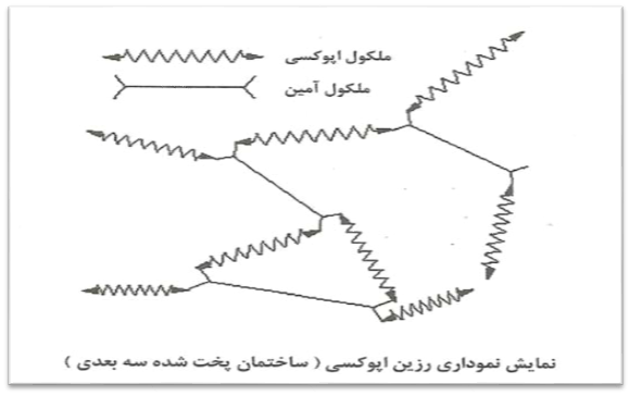 تفاوت دیگر رزین های اپوکسی با پلی استر ها در این است که رزین های اپوکسی به جای یک فعال کننده، به وسیله یک “سخت کننده” پخت میشوند. سخت کننده که اغلب یک آمین میباشد از طریق “واکنش افزایشی” موجب پخت رزین اپوکسی گردیده و هر دو ماده از طریق این واکنش در ساختار نهایی شرکت میکنند از دیدگاه شیمی معنی این واکنش اتصال خوردن سر دو اپوکسی مجزا با سر یک آمین است. این واکنش یک ساختمان مولکولی سه بعدی پیچیده را که در شکل زیر نشان داده شده تشکیل میدهد.