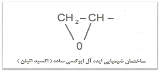 همچنین امروزه از اپوکسی ها در مصارفی دیگر مانند چسب ها، خمیرهای درزگیر، ترکیبات ریخته گری و سیل کننده ها (آب بندی کننده ها)، لعاب، پوشش های کف و رنگ ها استفاده میگردد. اصطلاح اپوکسی به گروه شیمیایی اطلاق میشود که در آن یک اتم اکسیژن با دو اتم کربن دیگر که به نوعی به هم پیوند خورده اند متصل میباشد. ساده ترین اپوکسی دارای یک ساختمان حلقوی سه عضوی بوده که اصطلاحاً به آن “۱ و ۲ اپوکسی” یا “آلفا اپوکسی” گفته میشود. شکل زیر ساختمان شیمیایی ایده آل یک اپوکسی را نشان میدهد که به عنوان ساده ترین مشخصه هر مولکول پیچیده اپوکسی شناسایی شده است.